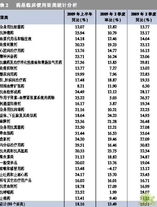 樣本醫(yī)院臨床用藥主要分為15大類(lèi),而前6大類(lèi)占86.95%份額(見(jiàn)表1),表明了這些大類(lèi)品種依然在醫(yī)院市場(chǎng)中舉足輕重。2009年各季度與同期比較,除了原料藥及非直接作用于人體藥物出現(xiàn)負(fù)增長(zhǎng)外,其余都呈2位數(shù)增長(zhǎng)。而2009年1~3季度用藥與上年同比,大于2009年上半年度的增幅,尤其是3季度的同比相對(duì)2季度的同比平均增長(zhǎng)了8個(gè)百分點(diǎn),說(shuō)明2009年4月6日中共中央國(guó)務(wù)院《關(guān)于深化醫(yī)藥衛(wèi)生體制改革的意見(jiàn)》的正式出臺(tái),以及同年8月18日《關(guān)于建立國(guó)家基本藥物制度的實(shí)施意見(jiàn)》、《國(guó)家基本藥物目錄(基層醫(yī)療衛(wèi)生機(jī)構(gòu)配備使用部分)》(2009版)公布后,醫(yī)院用藥的儲(chǔ)備從觀望開(kāi)始恢復(fù)到正常。
