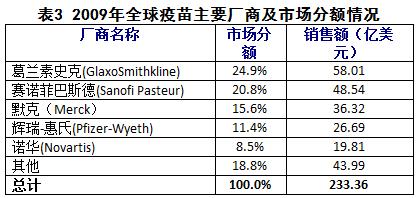 在2009年排名前五位的疫苗企業(yè)中,葛蘭素史克公司以24.9%的分額居第一位,這主要得益于其流感產(chǎn)品Fluvarix和Hiberix的喜人的銷售業(yè)績;緊隨其后的是安萬特-巴斯德,其市場(chǎng)分額為20.8%;默克公司以15.6%的市場(chǎng)份額位居第三;而輝瑞(惠氏)和諾華則分別以11.4%和8.5%的占有率分列第四和第五位。2009年,諾華強(qiáng)勁的增長主要來源于其在疫苗及診斷試劑領(lǐng)域?qū)ι帜X炎疫苗、流感疫苗、兒童免疫產(chǎn)品等的擴(kuò)展,使得該領(lǐng)域的年度銷售額高達(dá)19億美元。盡管如此,綜觀該公司在整個(gè)疫苗市場(chǎng)中的實(shí)力,其仍要落后于其他四位強(qiáng)勢(shì)的競(jìng)爭(zhēng)對(duì)手。