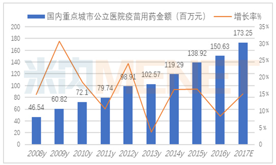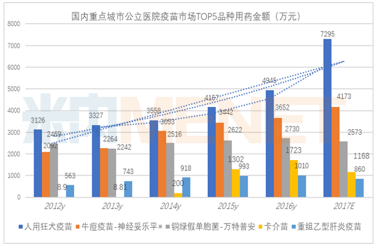 據(jù)米內(nèi)網(wǎng)數(shù)據(jù)顯示,2016年國內(nèi)重點城市公立醫(yī)院疫苗用藥金額為1.51億元,同比上一年增長了8.43%,按2017年1~3季度數(shù)據(jù)測算,2017年國內(nèi)重點城市公立醫(yī)院疫苗用藥金額將達到1.73億元,同比上一年增長率15.02%。其中用藥金額TOP5疫苗品種分別是人用狂犬疫苗、牛痘疫苗、銅綠假單胞菌、卡介苗和重組乙型肝炎疫苗,這5個品種占據(jù)了疫苗市場92%的比重。