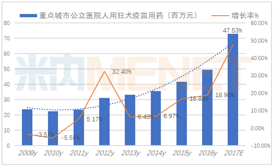 據(jù)米內(nèi)網(wǎng)數(shù)據(jù)顯示,2017年重點城市公立醫(yī)院人用狂犬疫苗達到了7295萬元的市場規(guī)模,同比上一年增長45%以上,TOP3廠商是遼寧成大生物、廣州諾誠生物和成都康華。狂犬病疫苗利潤較高,市場競爭較為激烈。