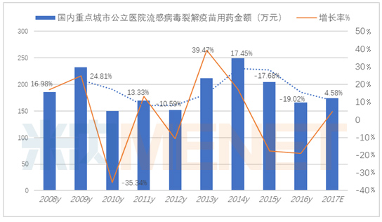 流感病毒威脅著人類健康,是導(dǎo)致多種繼發(fā)性疾病的源頭,成為了免疫力低下者的連環(huán)殺手,2017年重點城市公立醫(yī)院流感病毒疫苗市場同比上一年增長4.58%,多年來流感病毒疫苗表現(xiàn)出起伏跌宕的走勢。
