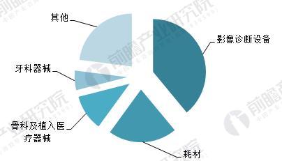從近三年我國醫療器械市場的產品結構來看,影像診斷設備占據最大的市場份額,近幾年均保持在40%左右,且呈不斷上升趨勢;其次是各類耗材,占據20%左右的市場份額;骨科及植入性醫療器械市場份額不斷下降;剩余的市場份額被牙科及其他類器械所占據。