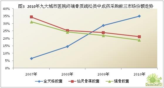 2010年九大城市醫(yī)院終端骨質(zhì)疏松藥市場(chǎng)前三位產(chǎn)品總的市場(chǎng)份額(CR3)達(dá)到75%,市場(chǎng)集中度極高。其中陜西金花企業(yè)(集團(tuán))股份有限公司的金天格膠囊以35%市場(chǎng)份額位居榜首,其次是貴州同濟(jì)堂制藥有限公司的仙靈骨葆膠囊,以21%的市場(chǎng)份額位居第二,緊跟其后的是占有19%市場(chǎng)份額的北京岐黃制藥有限公司生產(chǎn)的強(qiáng)骨膠囊。