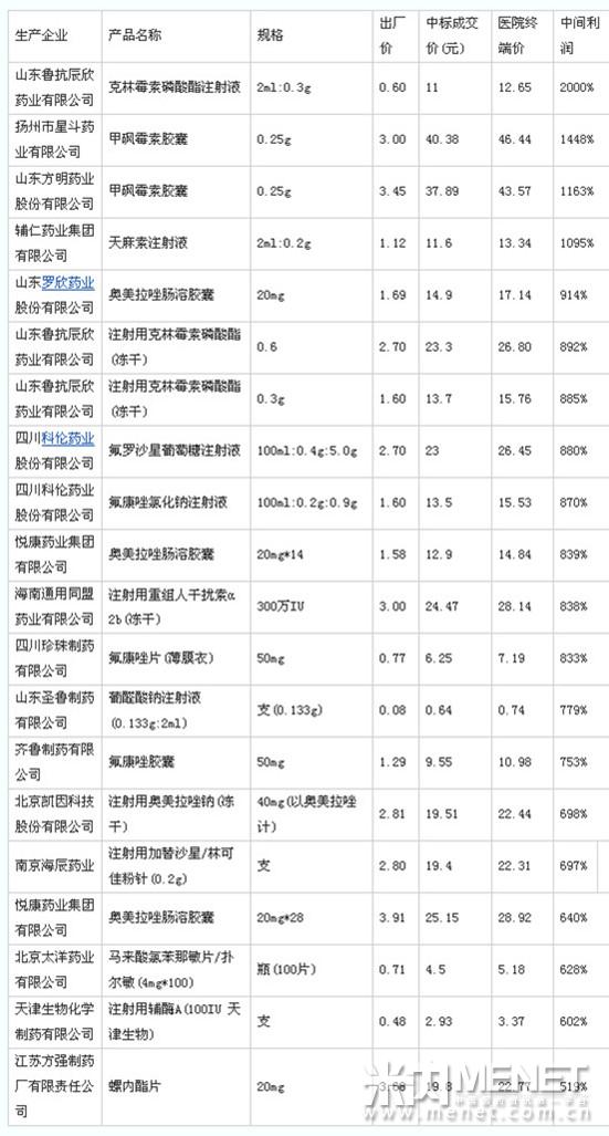 為了進(jìn)一步弄清北京市醫(yī)療機構(gòu)藥品集中采購目錄藥品中標(biāo)價和實際出廠價之間的差價,記者隨機挑選了抗菌、消炎、治胃病的20種常用藥進(jìn)行了長達(dá)一年的調(diào)查,最終調(diào)查發(fā)現(xiàn),這些藥品進(jìn)入北京各大醫(yī)院銷售,中間利潤都超過500%,其中輔仁藥業(yè)集團(tuán)生產(chǎn)的天麻素注射液從出廠到終端,中間利潤約1100%;山東方明藥業(yè)股份有限公司生產(chǎn)的甲砜霉素膠囊,中間利潤超過1100%;揚州市星斗藥業(yè)生產(chǎn)的0.25克甲砜霉素膠囊中間利潤高達(dá)1400%以上(見上圖)