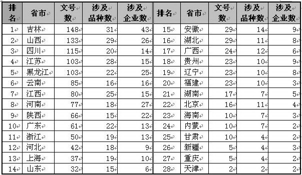 依據(jù)國家食品藥品監(jiān)督管理局已經(jīng)公布的2007年8月31日前數(shù)據(jù):63000余張國藥準(zhǔn)字Z系列中藥生產(chǎn)批準(zhǔn)文號(hào)中共有1358個(gè)中藥注射劑文號(hào)。中藥注射劑共涉及148個(gè)通用名品種,320家藥品生產(chǎn)企業(yè)。1358個(gè)中藥注射劑文號(hào)中按“國藥準(zhǔn)字Z1999XXXX—Z2007XXXX”編號(hào)的共有199個(gè)。中藥注射劑生產(chǎn)批準(zhǔn)文號(hào)按企業(yè)注冊(cè)所在地分布如下: